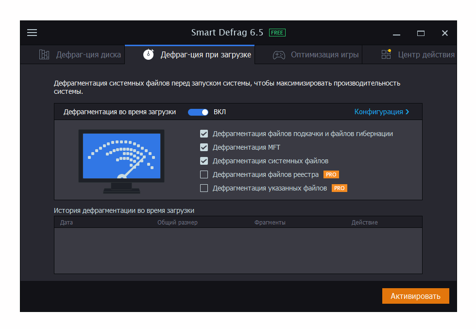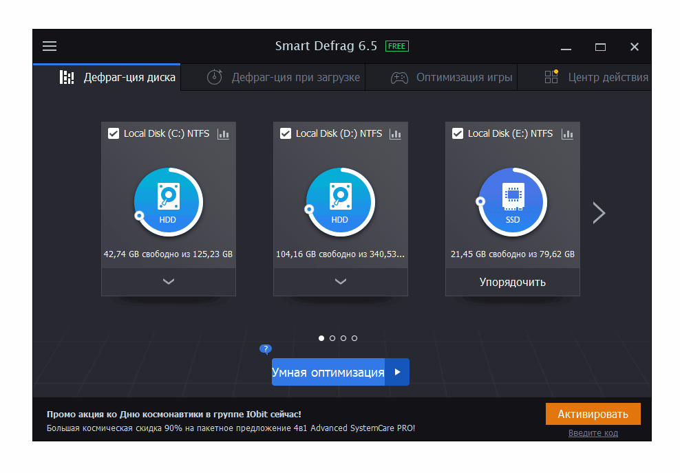 Smart Defrag – одна из функций Advanced SystemCare Free. Программа также включает десятки функций, которые могут просто не потребоваться рядовому пользователю. Если требуется просто выполнить дефрагментацию жесткого диска не устанавливая на ПК полную версию приложения, можно скачать утилиту Smart Defrag. К дополнительному функционалу утилиты можно отнести оптимизацию работы жесткого диска в процесс запуска компьютера, сжатие больших файлов, которые занимают много места на диске, очистку свободного пространства за счет удаления ненужных и временных файлов.