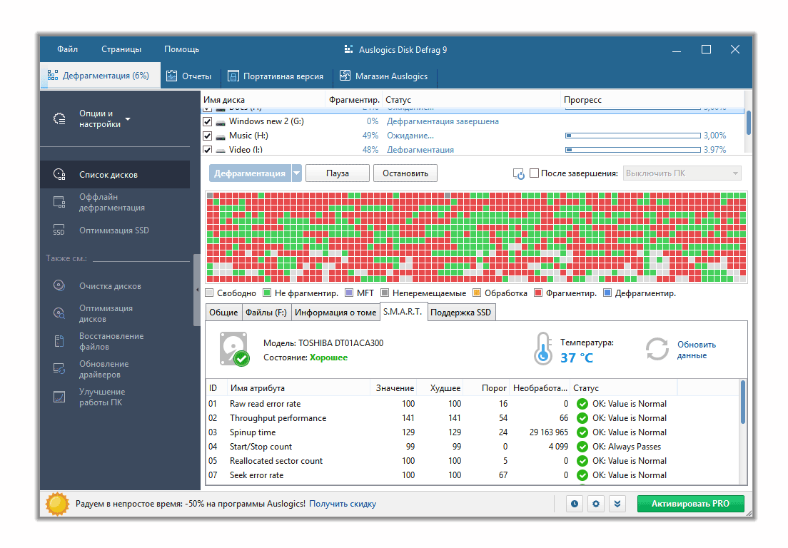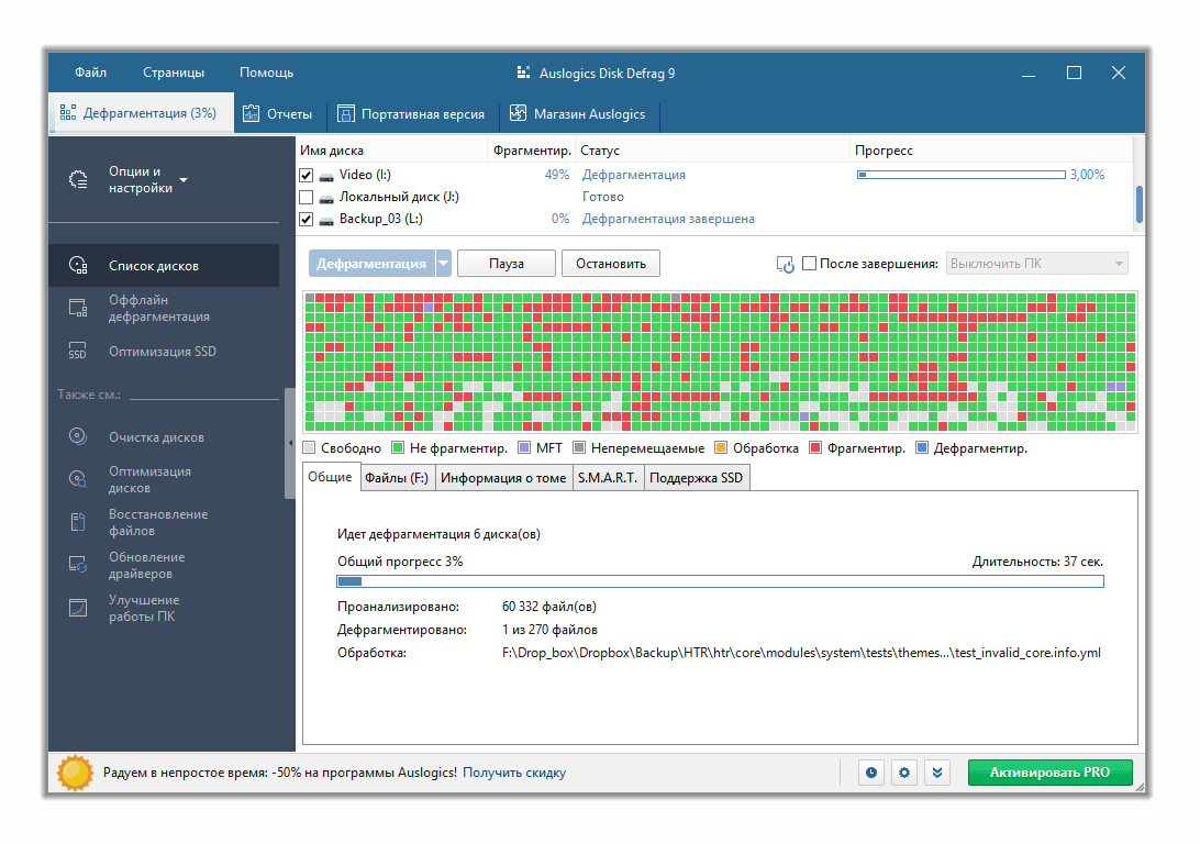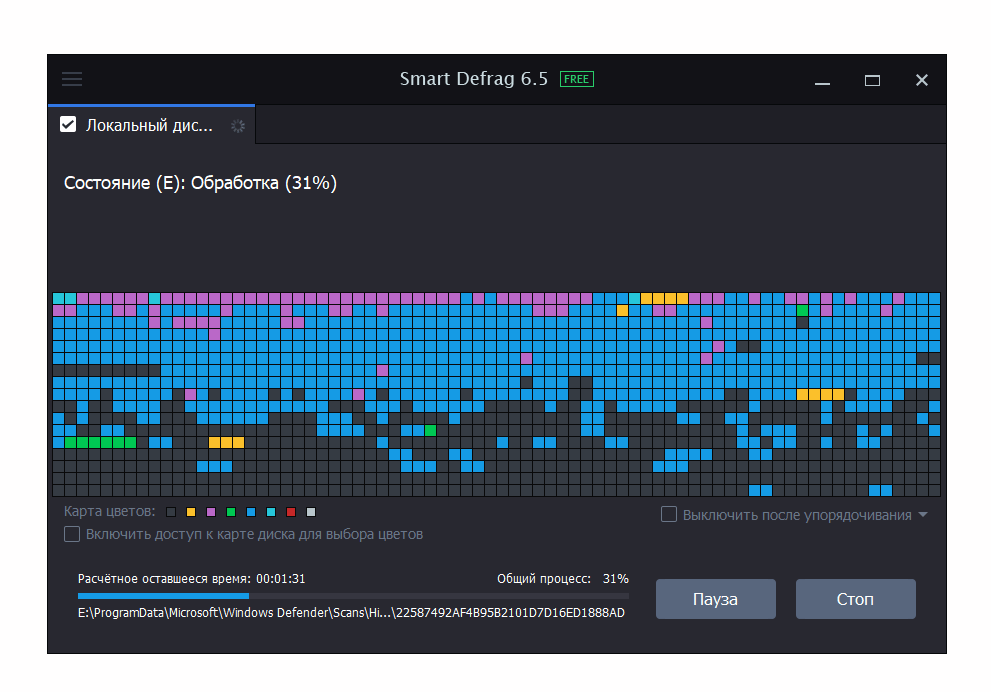 - Дефрагментация проводится в режиме реального времени, можно использовать компьютер в обычном режиме.