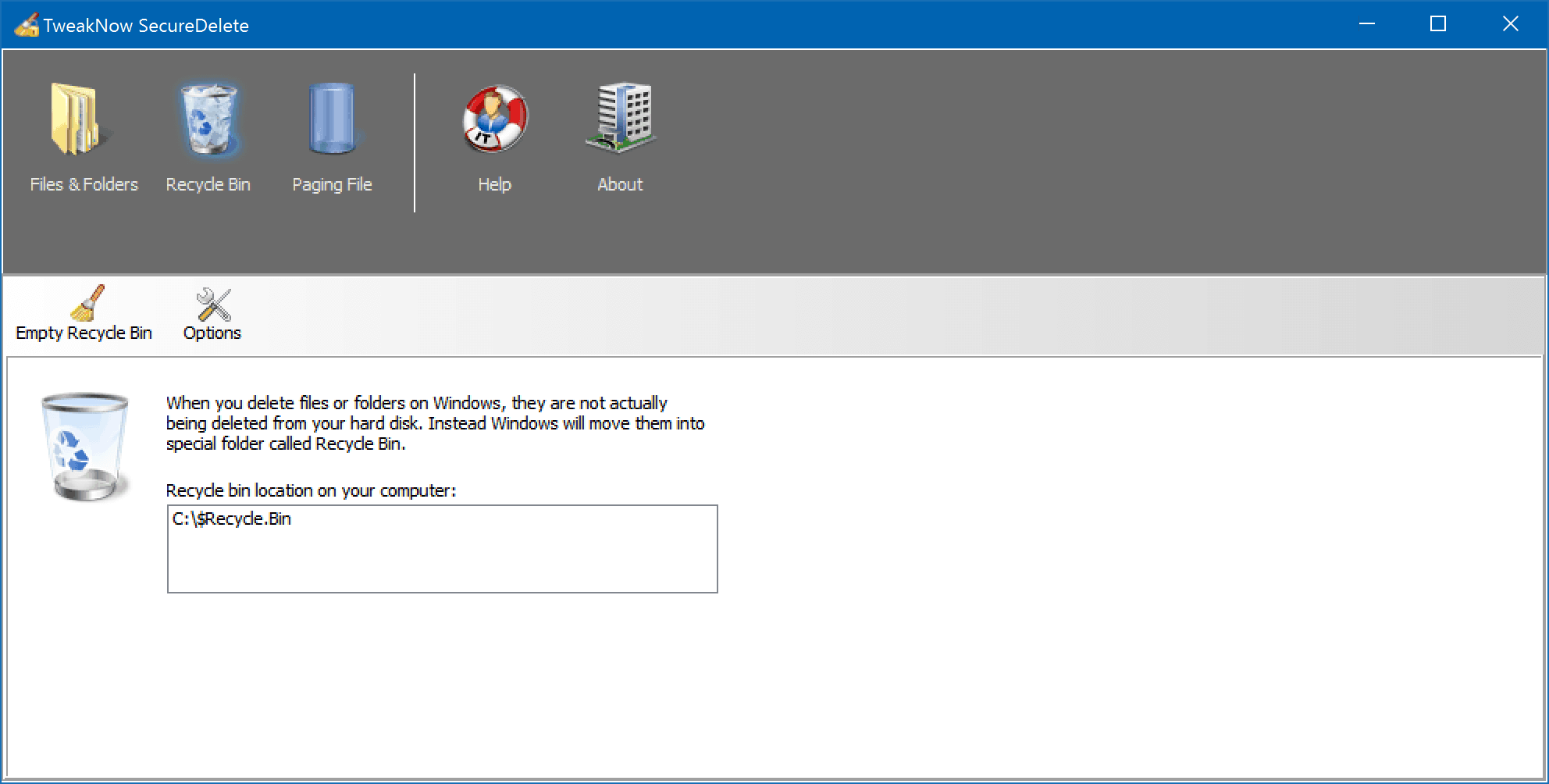 Если вы предпочитаете очиститель корзины с красивым графическим интерфейсом (GUI), TweakNow SecureDelete — лучший вариант для вас. Эта программа может навсегда удалить данные с внутренних и внешних дисков, очистить корзину, а также очистить файлы подкачки.