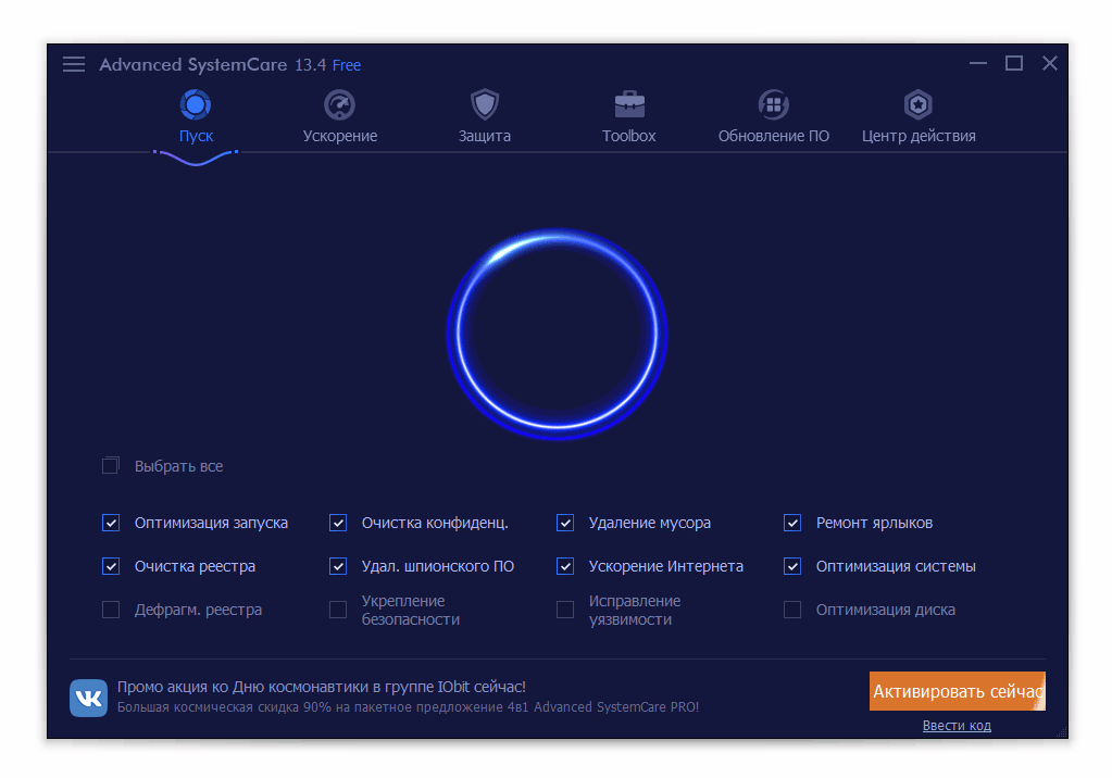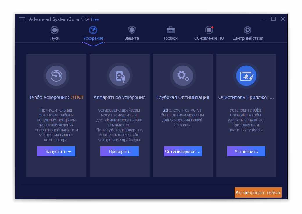 Ну и в дополнение сей обзора, хочу так же добавить про вкладку «Ускорение». Если после очистки системы вы все так же недовольны ее отзывчивостью, в SystemCare есть специальная вкладка ускорения, которая позволит сделать еще более производительнее вашу систему.