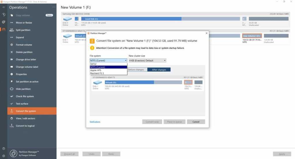 - Позволяет преобразовывать тома HFS в NTFS и MBR-диски в GPT и наоборот.