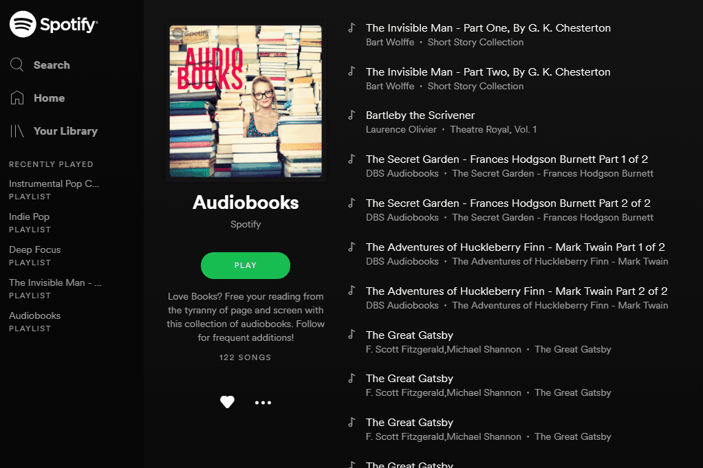 Бесплатные аудиокниги в Spotify организованы не очень хорошо, потому что Spotify — это сервис потоковой передачи музыки , а не веб-сайт аудиокниг, но их довольно много.