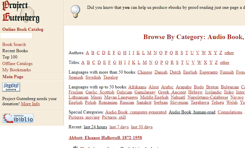 Самый простой способ найти аудиокнигу здесь — это просмотреть авторов и названия. Вы также можете просматривать их по языкам и по времени их добавления — за последние 24 часа, последние 7 дней и последние 30 дней.