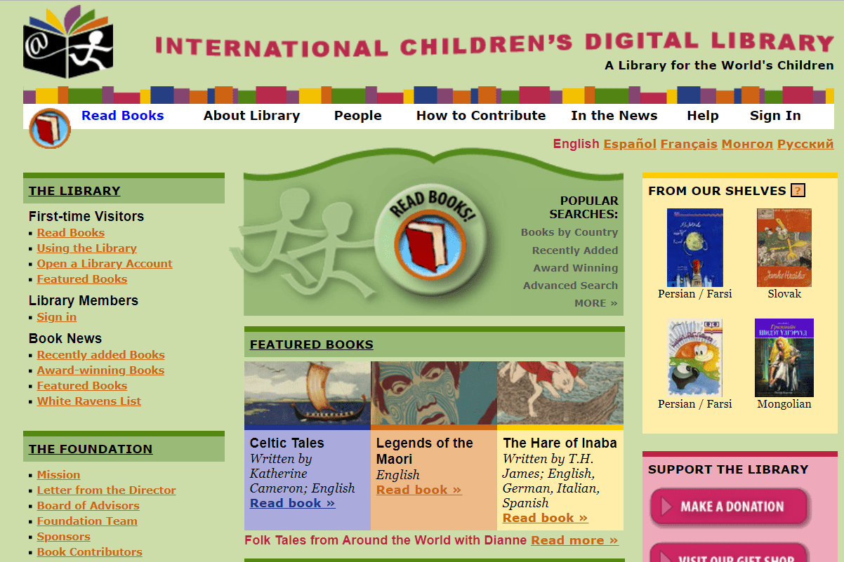 Просмотрите широкий выбор высококачественных бесплатных книг для детей в Международной детской цифровой библиотеке (ICDL). Это сканы физических книг, поэтому каждая страница представляет собой отдельное изображение, которое вы можете прокручивать и читать.