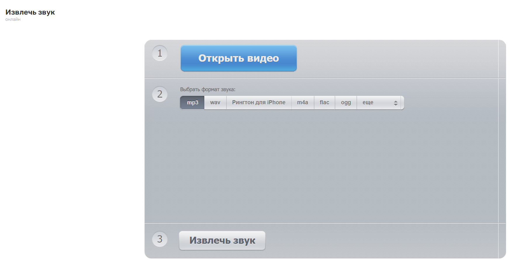 Этот бесплатный онлайн-сервис позволяет извлекать звуковую дорожку из видеозаписей. За счет удобства интерфейса в настройках разберется каждый пользователь. Чтобы воспользоваться данным инструментом, необходимо выполнить следующие действия: