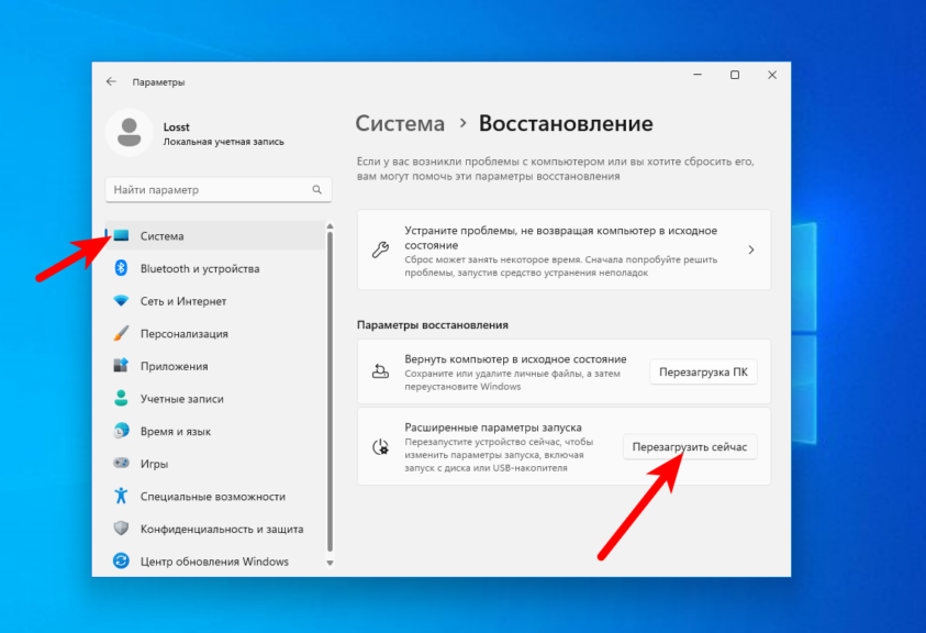 Большинство компьютеров на которые установлена Windows 11 или Windows 10 используют уже современный интерфейс управления загрузкой UEFI. А это значит что при определённых настройках Windows у вас могут возникнуть трудности с входом в интерфейс BIOS и выбором нужного устройства для загрузки. Но можете перезагрузиться в BIOS прямо из Windows. Для этого откройте Настройки, затем Система, затем Восстановление, найдите там Расширенные параметры и нажмите Перезагрузить сейчас: