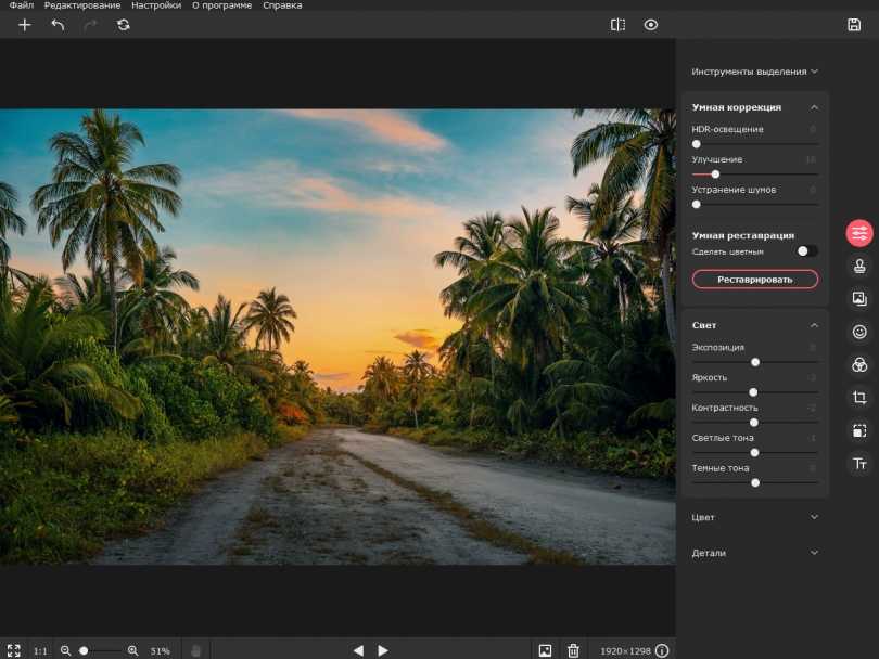 Начнем с новинки 2020 года – Movavi Picverse. В отличие от своего предшественника Movavi Photo Editor, эта программа намного больше опирается на возможности искусственного интеллекта. Среди инструментов, использующих ИИ – реставрация старых фото, автоулучшение и увеличение размера фото с сохранением качества. В программе вы можете работать как с изображением целиком, так и с его частью, используя любые инструменты улучшения: HDR-освещение, устранение шумов, цветокоррекция и другие. В фоторедакторе вы также найдете фильтры, инструменты замены фона, удаления объектов и ретуши. О ретуши стоит сказать отдельно. Условно эти инструменты можно разделить на две группы: исправление недостатков и добавление макияжа. Так, вы сможете убрать эффект красных глаз, отбелить зубы, убрать морщины, выровнять тон кожи, скорректировать фигуру и многое другое.