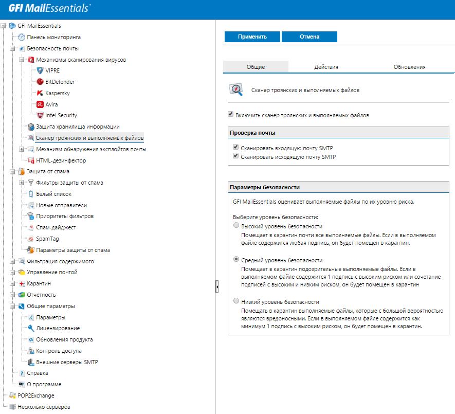 Всего же MailEssentials включает пять антивирусных движков — VIPRE, BitDefender, Kaspersky, Avira и McAfee. Каждый из них автоматически обновляется. В стандартной конфигурации GFI MailEssentials поставляется с движками VIPRE и BitDefender, остальные можно добавить при необходимости. Например, опционально GFI MailEssentials позволяет проверять почту антивирусным движком Kaspersky со встроенной базой данных сигнатур рекламных и шпионских программ, известных троянов.