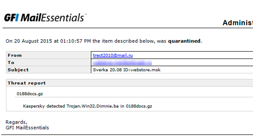 Рисунок 10. Троян, пойманный движком Kaspersky