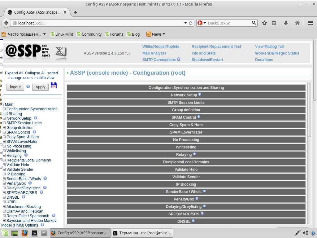 Практически все настройки производятся через веб-интерфейс, по умолчанию используется , данные для входа — . Но готовься: параметров там очень много, и придется потратить время, чтобы все обойти. Для хранения данных по умолчанию используется BerkeleyDB, можно подключить MySQL, DB2, PgSQL, Firebird. Возможна синхронизация настроек между двумя серверами ASSP и автоматическое обновление движка и модулей через PPM или CPAN.