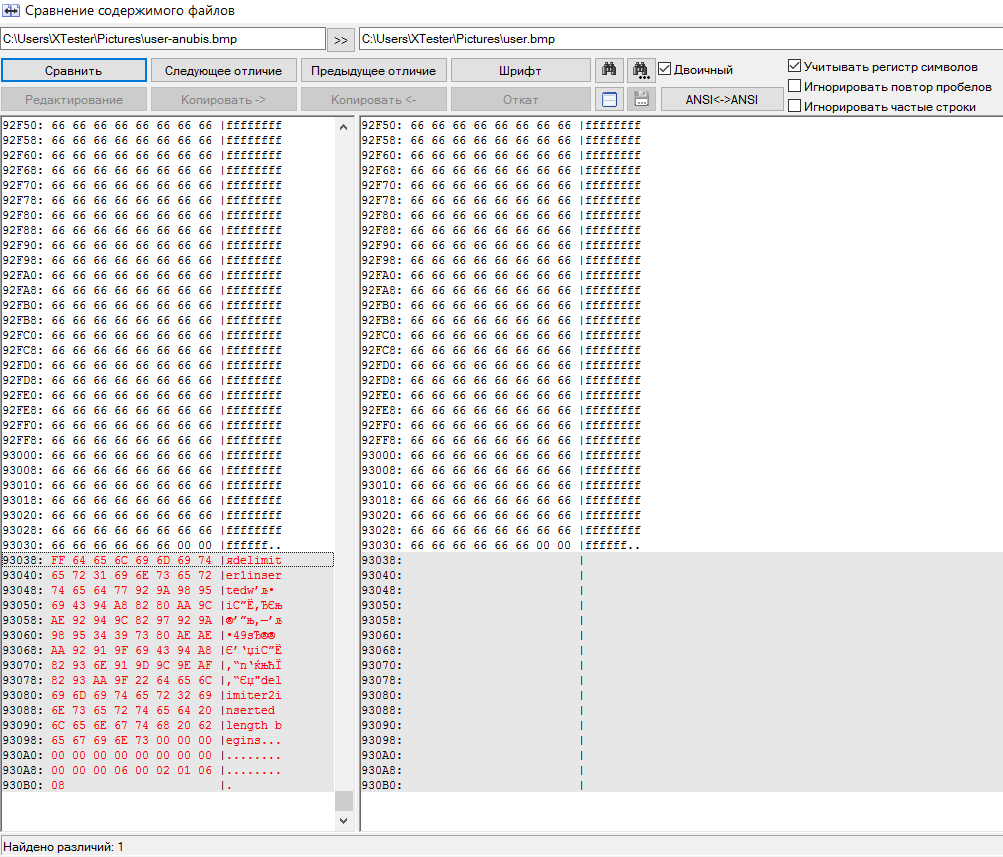 Как видно из побайтного сравнения исходного файла BMP с содержащим скрытый текст, программа работает очень примитивно. Она просто дописывает данные в конец файла. Данные зашифрованы, но снабжены характерными указателями: , , . Простым поиском файлов, содержащих такие строки, легко найти все стегоконтейнеры. Такую утилиту можно использовать в качестве иллюстрации простейшего метода стеганографии, но для серьезных задач она совершенно не подходит.