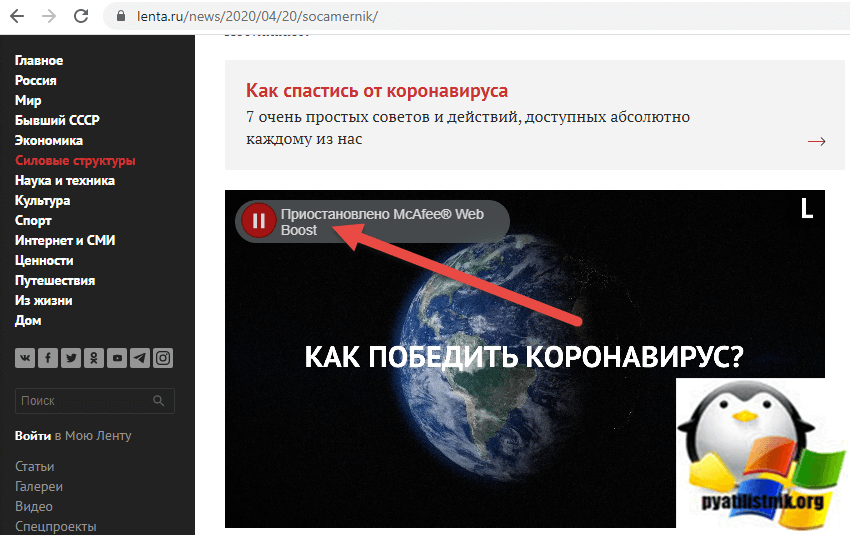 Если честно для меня антивирус MaCafee всегда был очень слабым и я его не порекомендую никому, но тут я решал проблему, что мой сайт попал в его базу, и при попытке на него войти, у людей использующих расширение от антивируса выскакивало уведомление и мне пришлось это исправлять путем установки Web Advisor. В комплекте с ним шло расширение McAfee Web Boot и как оказалось оно прекрасно запрещает запуск видео без вашего разрешения, в итоге вы будите видеть вот такую картину. Пример со шняжной ленты-ру. В углу с видео вы будите наблюдать статус «Приостановлено McAfee Web»