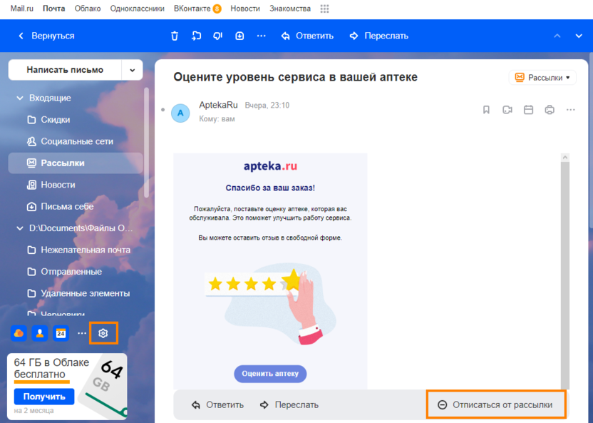 Mail.Ru дает возможность запретить получение писем-рассылок, для этого нужно нажать кнопку «Отписаться от рассылки», которая находится внизу письма. При этом будет предложено сразу удалить все письма этой рассылки или пометить их прочитанными.