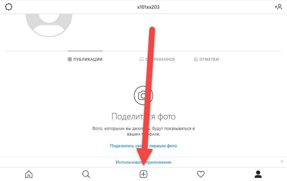 Нажимаем по значку плюса (+), расположенному в нижней части экрана. Выбираем изображения, которые нужно добавить на страницу. По желанию применяем фильтры или редактируем картинки, а после кликаем «Поделиться». Созданная публикация должна в течение нескольких секунд появиться в профиле.