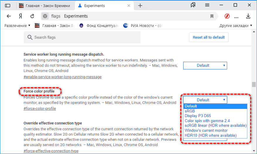 При искажении цветов перейдите по адресу browser://flags и выберите другое цветовое пространство – измените значение опции Force color profile.