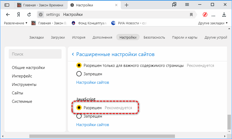 - В самом низу найдите пункт JavaScript и перенесите переключатель в положение «Разрешен».