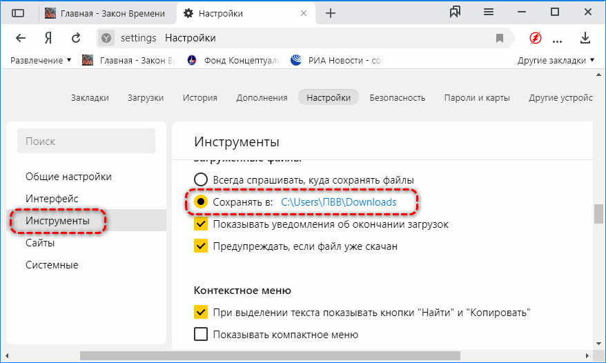 Когда в Яндекс.Браузере картинки не сохраняются, обозреватель следует обновить или проверить, существует ли каталог с загрузками. В разделе параметров конфигурации «Инструменты» измените каталог для загрузок или создайте папку Downloads по указанному пути. Из-за ее отсутствия программа не может сохранять файлы на диск.