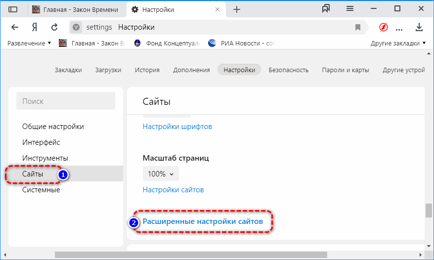 - В параметрах конфигурации кликните «Сайты» и перейдите в расширенные настройки.