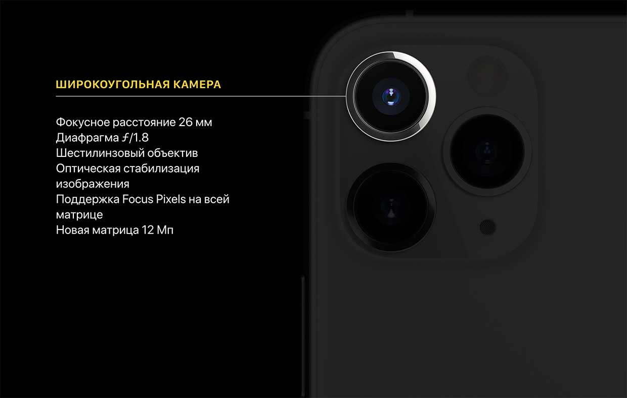 «Ширик» в iPhone 11 и Pro состоит из шести линз. Снимает в разрешении 12 мегапикселей при размере пикселя 1,4 мкм (микрометр). Фокусное расстояние – 26 мм, диафрагма ƒ/1.8.