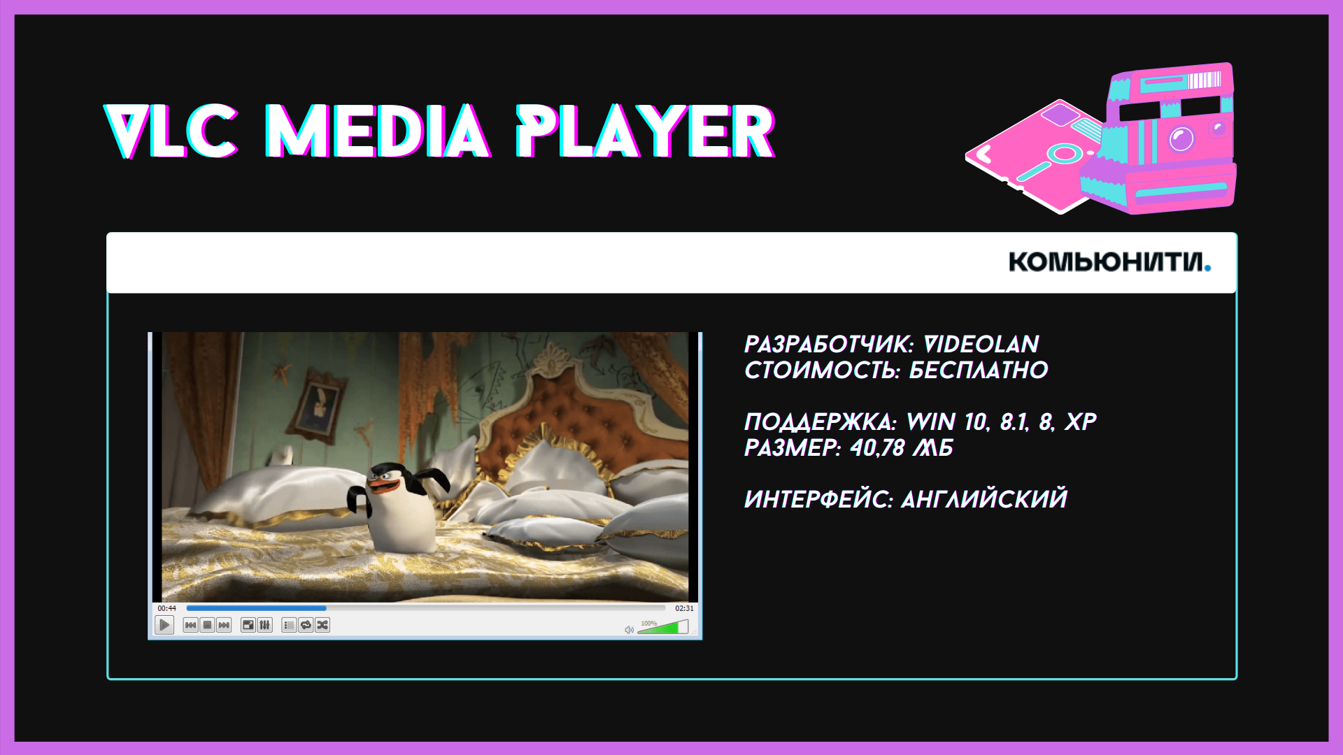 - Поддерживает все современные форматы видео