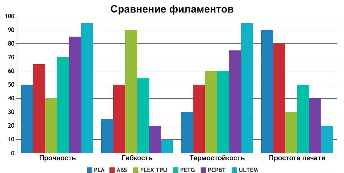 Наиболее распространенные типы филамента для FDM-принтеров: