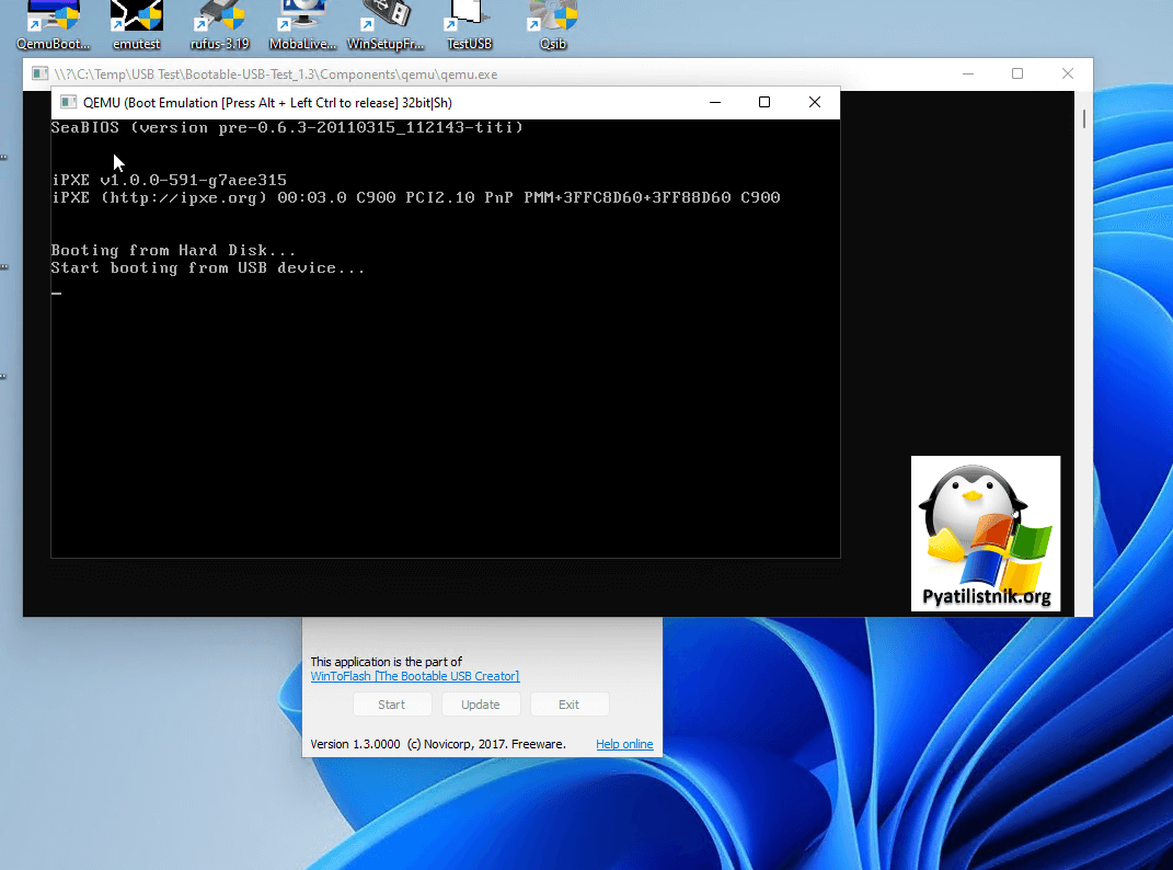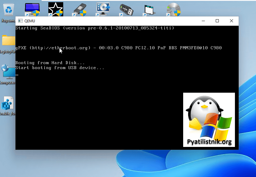 У вас так же будет открыто окно эмулятора QEMU. У меня сразу определился носитель, и идет попытка с него загрузиться, о чем свидетельствует надпись «Booting from Hard Drive — Start booting from USB device»
