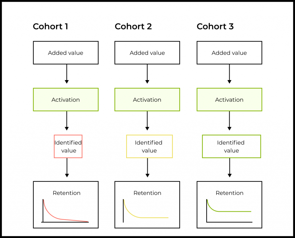 - Команда маркетинга привлекла когорту пользователей, которая на 70% состоит из пользователей из целевого сегмента рынка, а на 30% — из пользователей из смежных сегментов, где product/market fit пока еще не достигнут.
