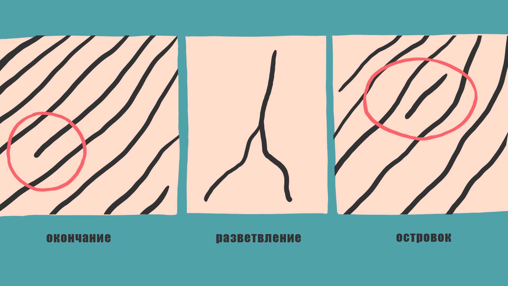 Схематичное изображение элементов отпечатков пальцев. Иллюстрация: Светлана Чувилёва / Wylsacom Media