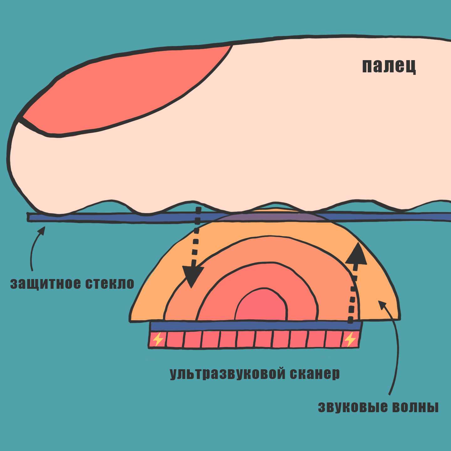 Принцип работы такой: в ультразвуковом сканере есть пьезоэлектрик. Как только на него поступает ток, он начинает очень быстро колебаться. За секунду таких колебаний может быть примерно 32 тысячи. При колебании он генерирует звуковые волны в ультразвуковом диапазоне. Они рассыпаются во все стороны, включая в ту, где находится палец. Какие-то волны, отражаясь от поверхности пальца, возвращаются быстро, а какие-то — с небольшой задержкой. На основе времени их возвращения и создаётся матрица отпечатка пальца.