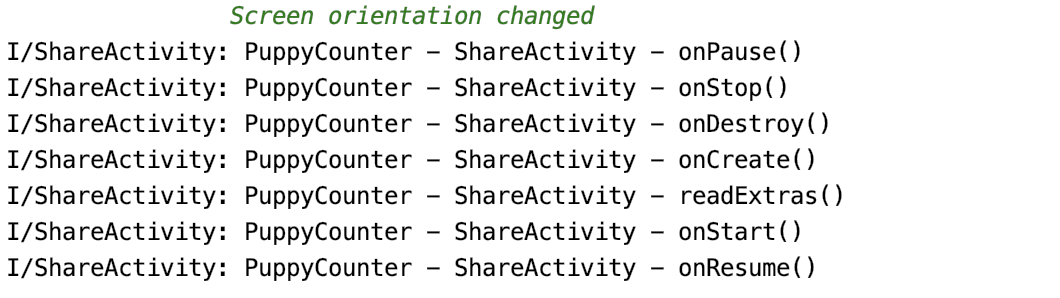 Измените ориентацию экрана на экране Share и обратите внимание на то, что происходит. Вы увидите, что приложение сохранило состояние dogCount