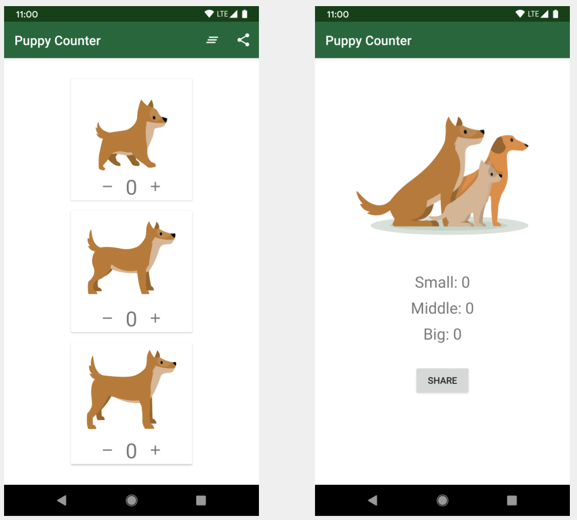 - Главный экран: позволяет подсчитывать собак разных размеров. Вы можете нажимать на карточки или на кнопки «плюс» и «минус», чтобы обновить счетчики. На верхней панели у вас есть две кнопки: первая сбрасывает значения, а вторая открывает экран «Share» (Поделиться).