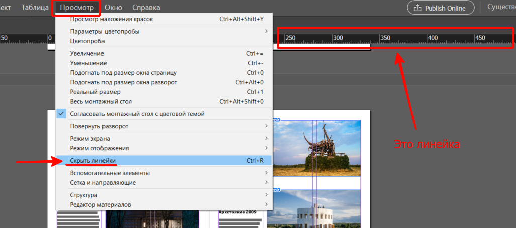 Кроме того, в верхнем меню легко настроить вид основной рабочей области и ее вспомогательных инструментов. Например, для верстки часто бывают полезны линейки с отметками размеров макета. Они включаются и выключаются в верхнем меню.