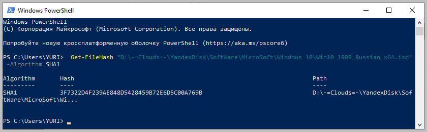 Get-FileHash «Disk:\Full Path to file\File Name.Extension» -Algorithm SHA1