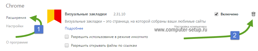 Далее переходим в меню «Расширения» и ищем все что касаемо Яндекса или вкладок. Удаляем расширения Яндекса, если такие имеются, кликая на «Корзине», просто иногда с установкой с интернета различного рода программ, Вы можете и не знать о установленном новом ПО.