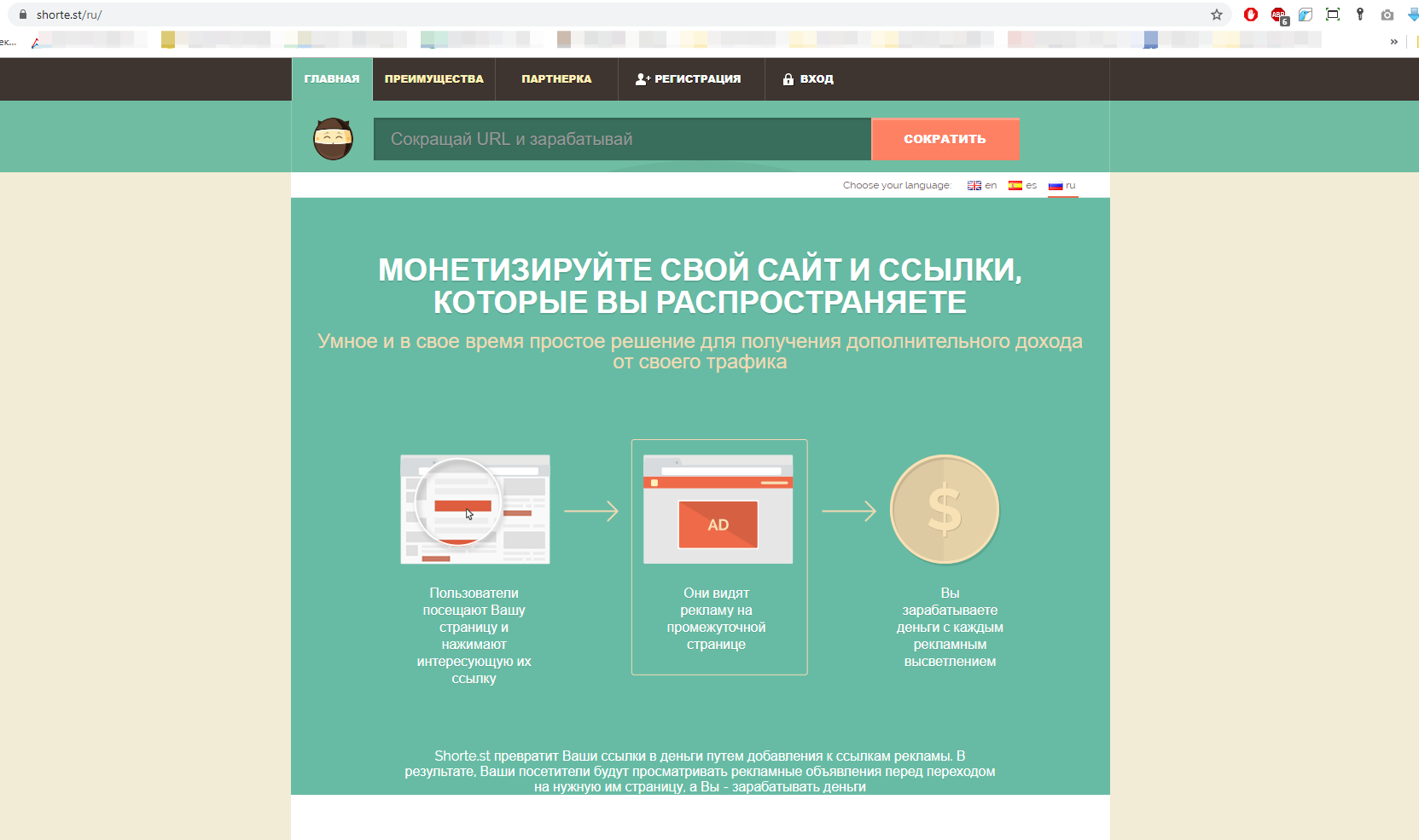 В строке браузера может отображаться и другой адрес. Например, shorte.st/ru/