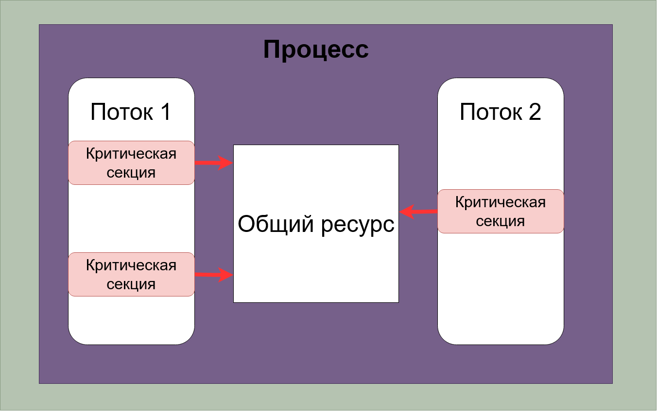Возникают, так называемые, критические секции – участки исполняемого кода программы, в которых производится доступ к общему ресурсу (данным или устройству), который не должен быть одновременно использован более чем одним потоком выполнения.