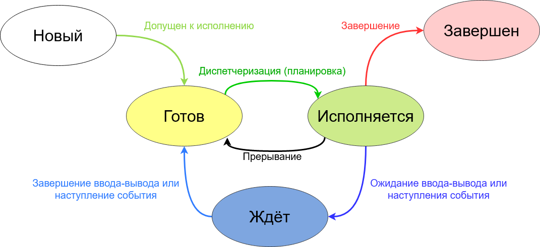В целом, смена контекста происходит между состояниями «Готов», «Ожидает» и «Исполняется».