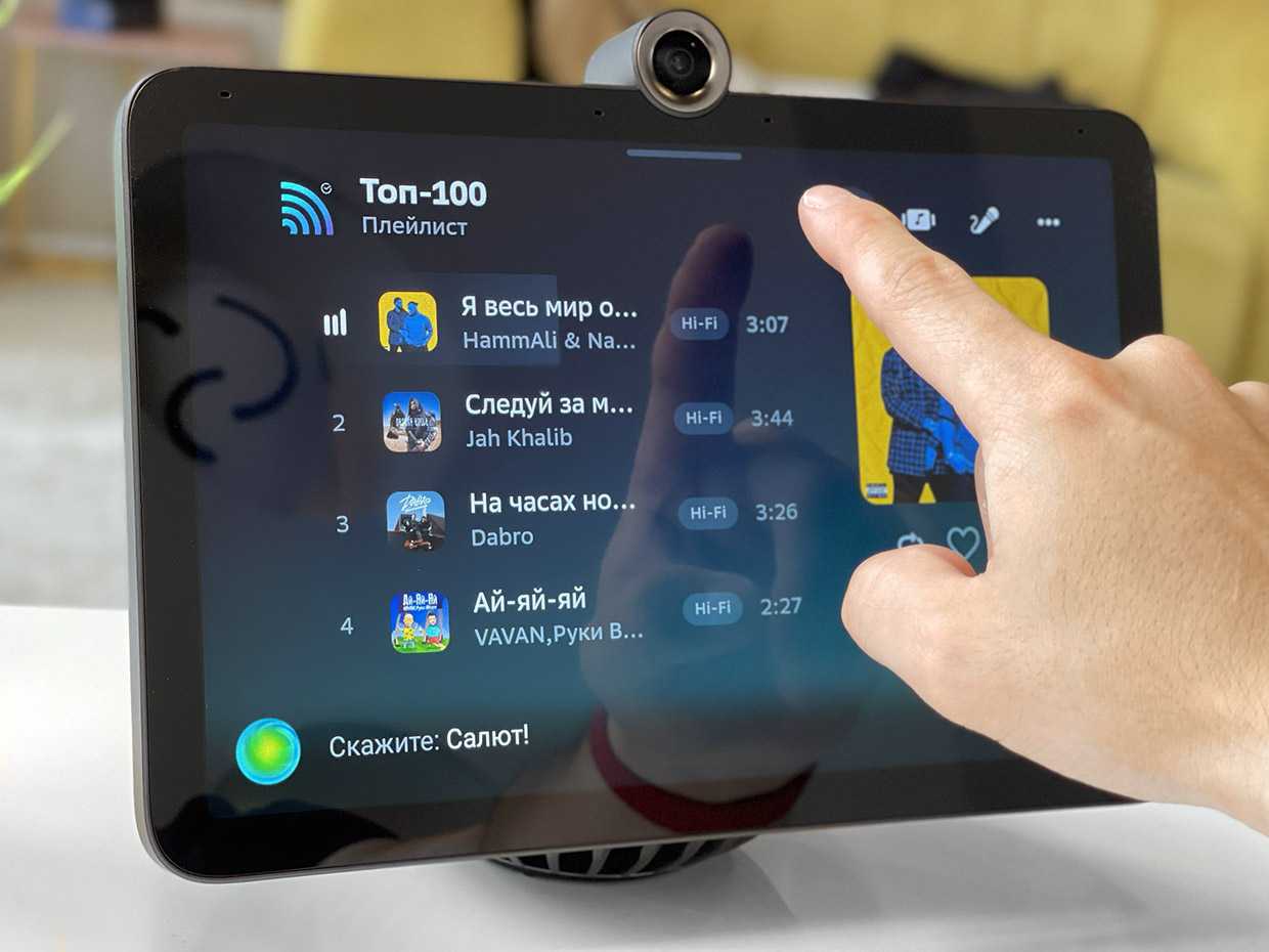 3. У гаджета умная камера. Она отлично считывает жесты рук, а во время видеозвонка будет держать лицо в фокусе, даже если вы передвигаетесь по комнате. Прямо как глаза собеседника при реальном общении.4. SberPortal не просто издаёт звук, когда вы слушаете любимую музыку или смотрите сериал, а со всех сторон окружает вас глубокими басами и чистыми верхними частотами. Всё дело в японских алгоритмах обработки звука и уникальной архитектуре акустической камеры от американской компании Harman Kardon, которая, на минуточку, поставляет оборудование для Mercedes.