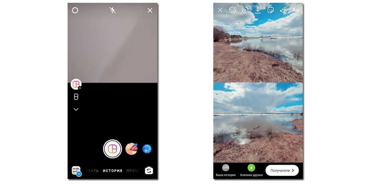 Добавлять фото и видео в коллаж сторис так же, как и без коллажа. Выбор компоновки картинок в левом меню по центру экрана