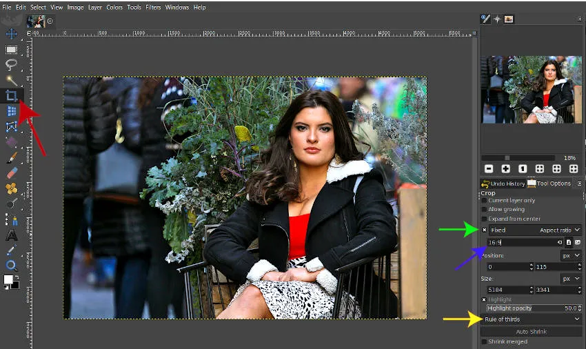 Или вы можете перейти к параметрам инструмента и настроить область обрезки. Например, если я хочу, чтобы кадрирование было с определенным соотношением сторон (которое является отношением ширины к высоте), я могу установить флажок «Фиксированный:» (зеленая стрелка) и выбрать «Соотношение сторон» в раскрывающемся списке.