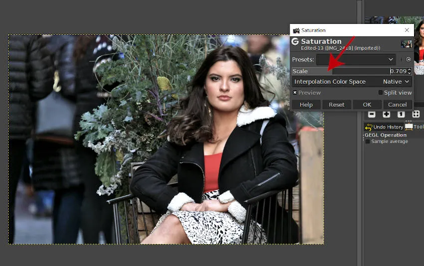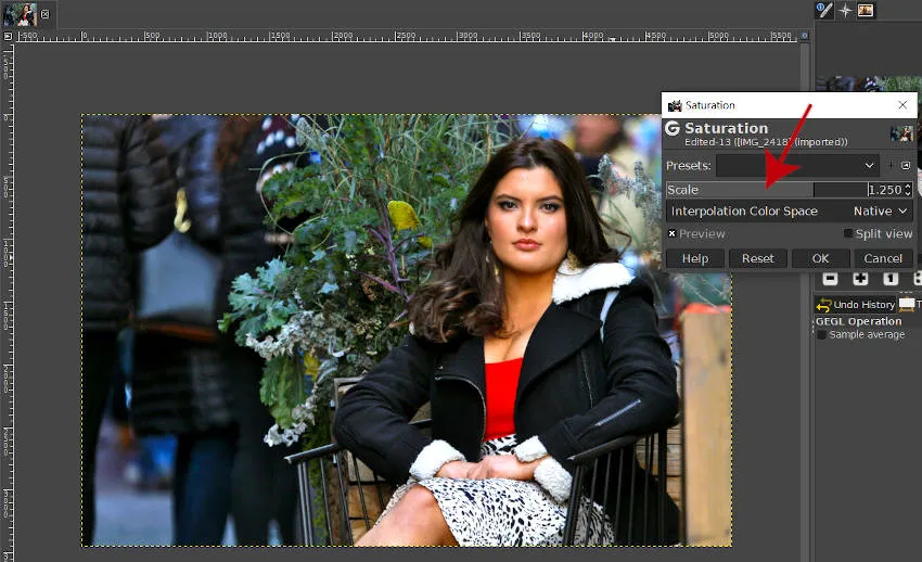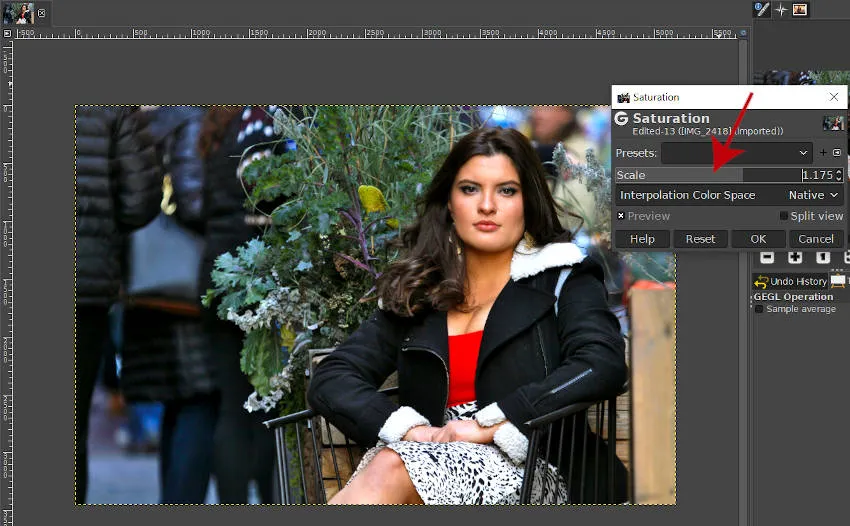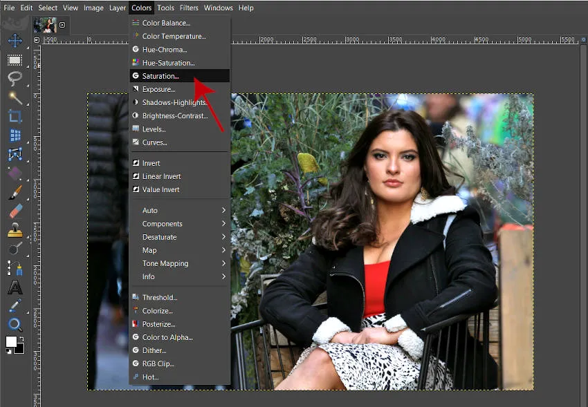 Чтобы настроить насыщенность фотографии в GIMP, выберите «Цвета»> «Насыщенность» (красная стрелка на изображении выше).