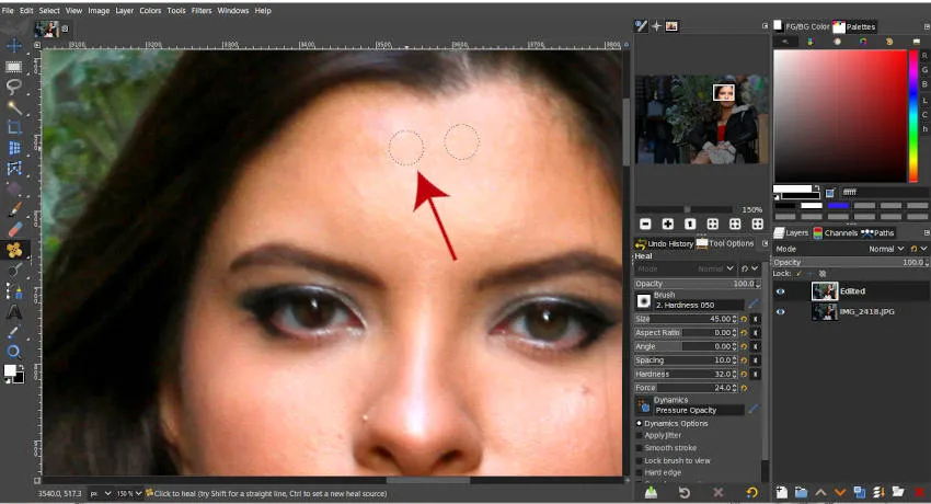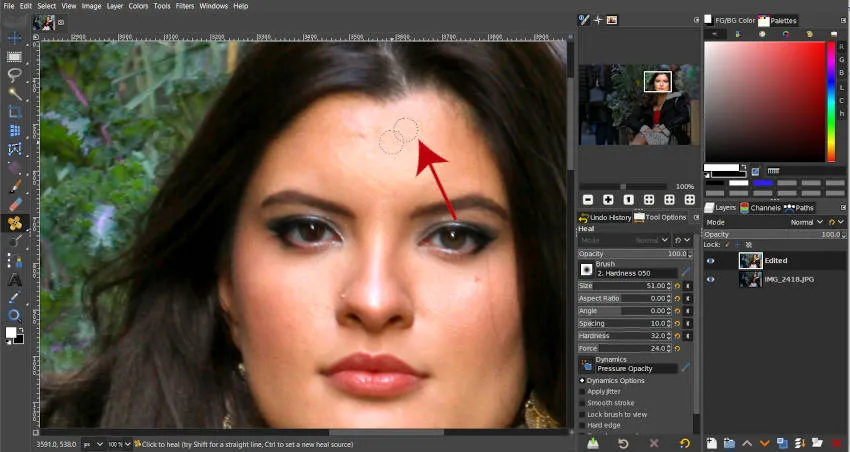 Как только ваша кисть настроена по вашему вкусу, вам нужно будет взять «исходную» область для инструмента «Лечение», удерживая клавишу Ctrl и щелкая мышью по области цвета лица, которая близка по цвету к области, которую вы лечите ( красная стрелка на изображении выше). Теперь будет две насадки.