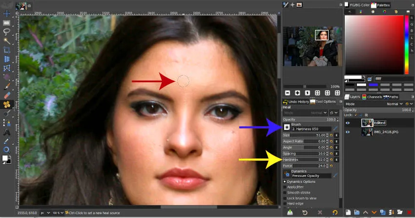 В этом случае я использовал инструмент «Лечение», чтобы удалить небольшой шрам на лбу модели (красная стрелка). Вы можете использовать этот инструмент для удаления различных мелких артефактов, дефектов и т. Д. На вашем изображении.