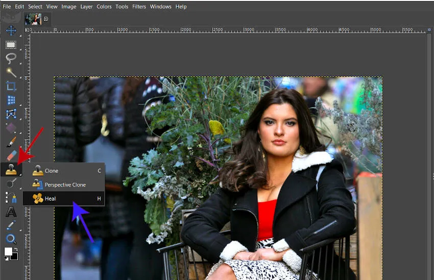 Для этой фотографии я буду использовать только инструмент Heal, так как у меня нет каких-либо серьезных ремонтов или подкрашиваний, которые необходимо выполнить для этой модели. Чтобы взять свой инструмент исцеления, я могу нажать клавишу H на клавиатуре или щелкнуть и удерживать группу инструментов клонирования на панели инструментов (красная стрелка на фото выше) и выбрать инструмент лечения из этой группы (синяя стрелка — инструмент группы — это новая функция, представленная в GIMP 2.10.18.Если вы используете старую версию GIMP, просто щелкните значок Heal Tool на панели инструментов).