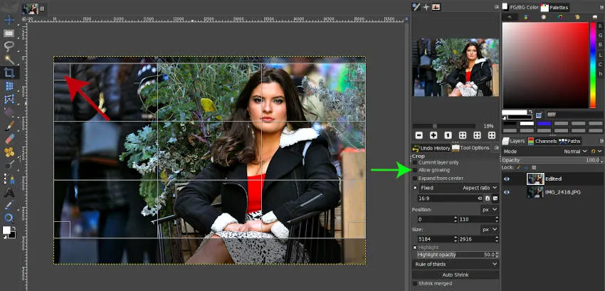 Я могу перетащить область обрезки, пока она не достигнет границы моего изображения. Если ваш обрез продолжает пересекать границу изображения, убедитесь, что опция «Разрешить выращивание» не отмечена в параметрах инструмента (зеленая стрелка).