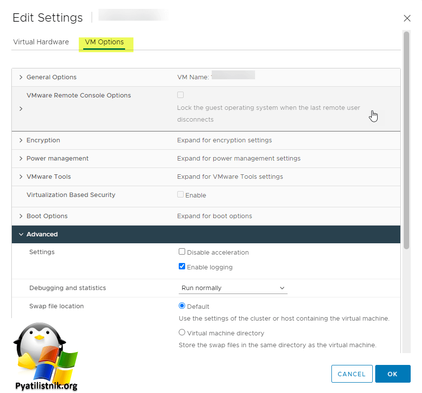 Выберите нужный виртуальный сервер, он обязательно должен быть выключен, в противном случае вам придется все равно его перезагружать. Далее откройте его свойства и перейдите на вкладку «VM Options«, найдите там раздел «Advanced«.
