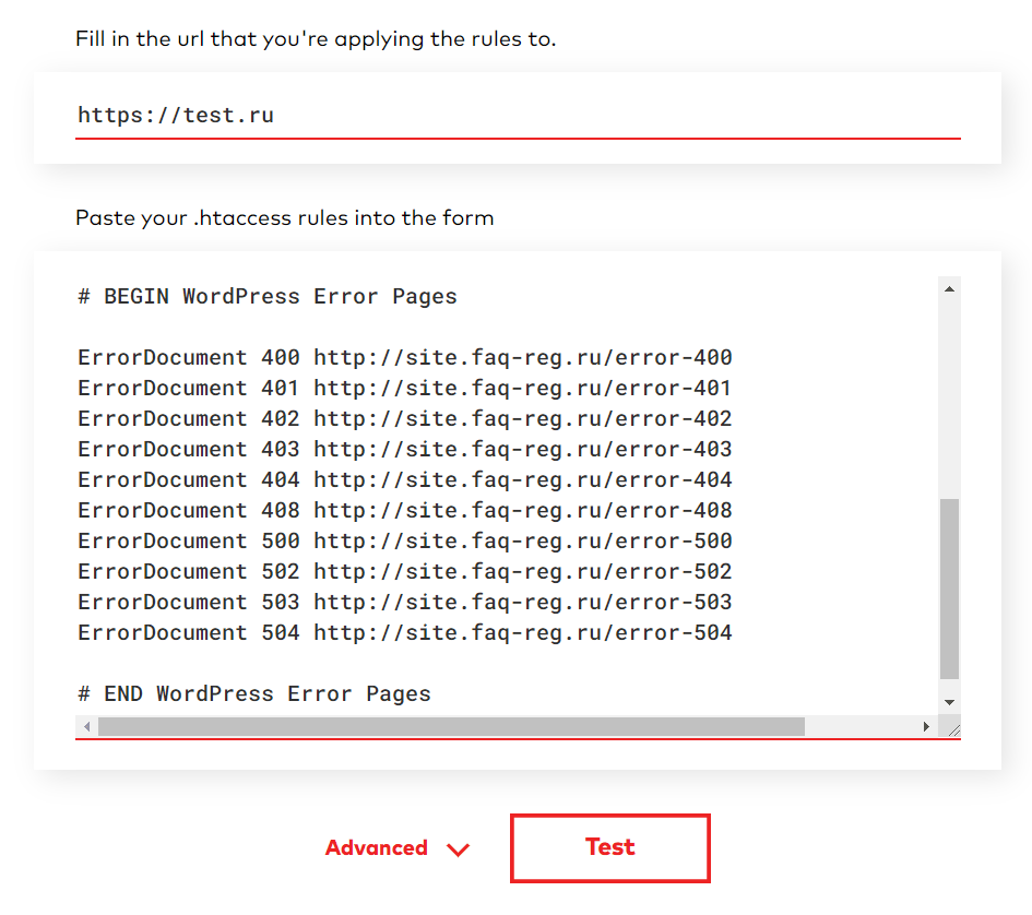 Найти ошибку может помочь онлайн-тестер. Вставьте свои данные .htaccess и адрес сайта, начиная с https://. Нажмите Test: