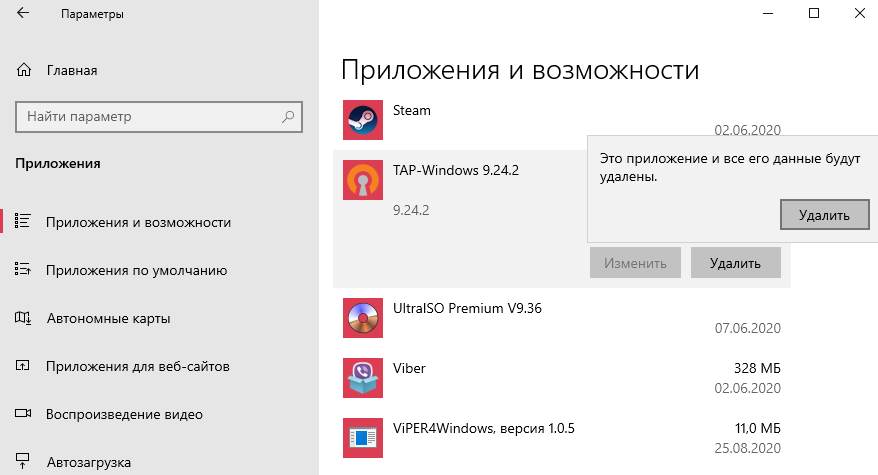 После удаления все VPN программы перестанут работать. Перейдите в раздел Параметры > Приложения > Приложения и возможности. Выделите TAP-Windows 9.24.2 и нажмите несколько раз Удалить (или запустите Uninstall.exe в папке C:/ Program Files/ Tap-Windows).