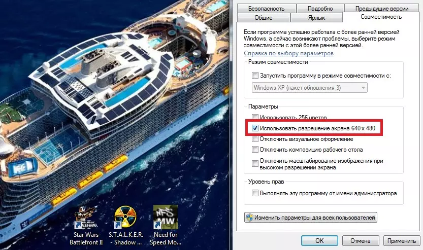 Если же игра требует разрешения 640х480, а монитор его не поддерживает, есть ещё один вариант. Он выбирается в свойствах ярлыка на вкладке совместимости.