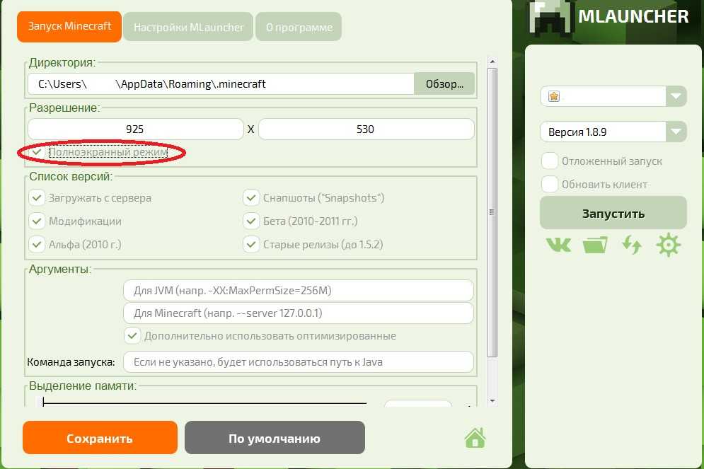 Найти пункт, отвечающий за запуск в оконном или полноэкранном режиме;